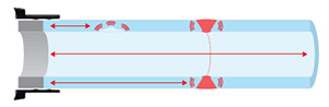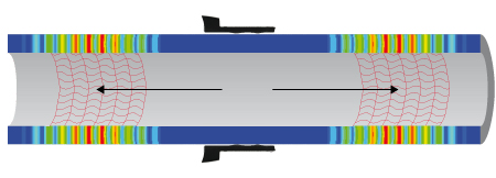 UltraWave LRT系統(tǒng)激勵(lì)了低頻超聲波后,超聲波會(huì)從探頭組裝圈的兩側(cè)沿管道軸的方向傳播。有多個(gè)因素會(huì)影響遠(yuǎn)檢測(cè)距離:管道配置、環(huán)境、管道內(nèi)的流體類型以及涂層類型。傳播的扭轉(zhuǎn)波可以探測(cè)到管道整個(gè)橫截面區(qū)域的一般變化,以及材料屬性的變化。