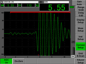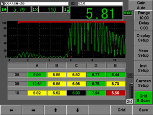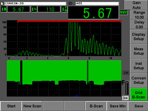 腐蝕模塊還包含一個時控B掃描視圖。這個B掃描的采集基于單個回波或來自回波到回波測量。B掃描可以為最多3個用戶定義的厚度范圍顯示彩色編碼。B掃描用于快速采集潛在缺陷區域的數據并制作綜合性報告。