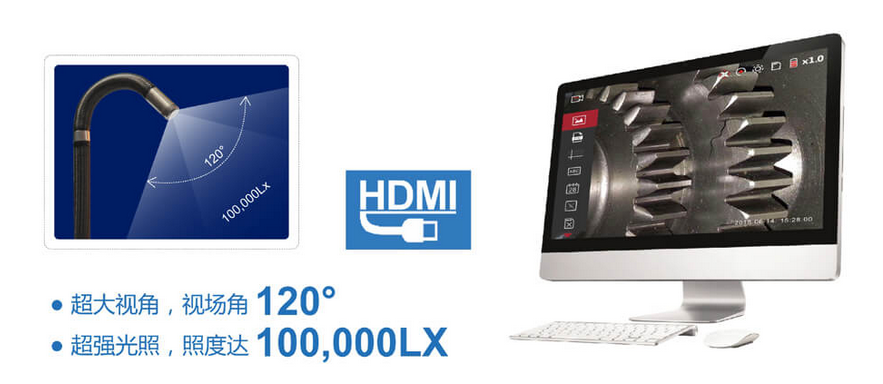 C50電控高清工業內窺鏡微軟雅黑后置大功率LED照明,光纖導光,照度高達10萬Lx,適用于黑暗及惡劣環境,照度是普通內窺鏡的50倍,并具有亮度7級循環調節功能,檢測中可根據環境光源及時調整。多景深、多視場角,讓初次使用者也能獲得良好的檢測效果。配備HDMI視頻高清輸出接口,通過專用數據線與PC端連接,非常適用于機修師檢測,有助于快速找到被檢測物的問題,解決難題。