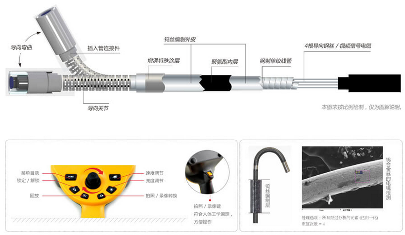 C50電控高清工業內窺鏡采用新型雙鎢合金絲材料編制的四層插入管,比不銹鋼絲插入管擁有更為緊密的編織層,讓插入管的耐磨性能提高20倍,柔韌性能提升4倍,使用壽命與操作的靈敏性同時增強。