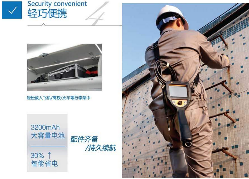 C50電控高清工業內窺鏡從多角度來保證續航能力,在產品設計上運用低耗能技術,實現一組鋰電池可續航4個小時,并配有一組備用電池,支持長時間的檢測工作。