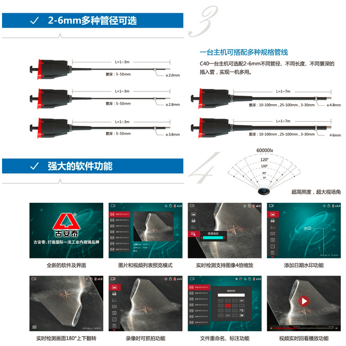 一臺主機可選配2-6mm不同管徑、長度、景深的插入管,實現一機多用,為用戶最大限度節約成本。